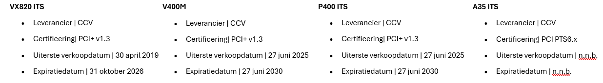 Een betaalautomaat mag niet meer gebruikt worden wanneer de certificering verloopt. Hieronder vind je enkel modellen van CCV met hun expiratie datum.